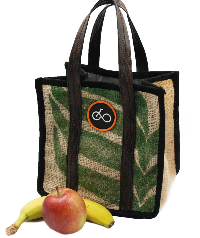 This bag is made from recycled coffee bean sacks and bicycle inner tubes. A lunch bag which also makes a great reusable gift bag too!
