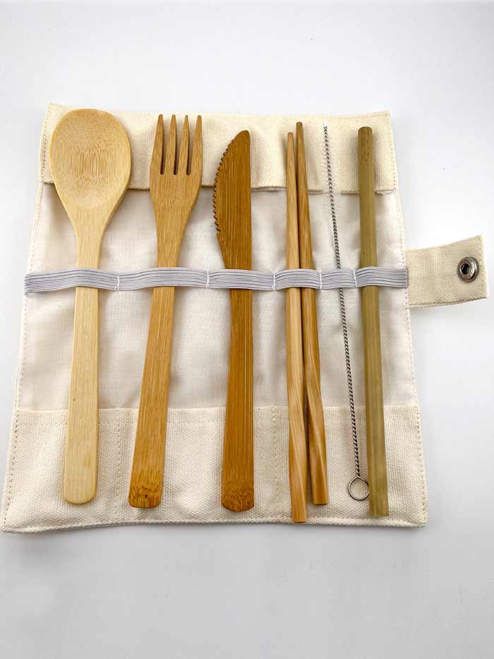 Comprises of knife, fork, spoon, pair of chopsticks, drinking straw and straw cleaning brush plus a cotton holder to keep it all together.
