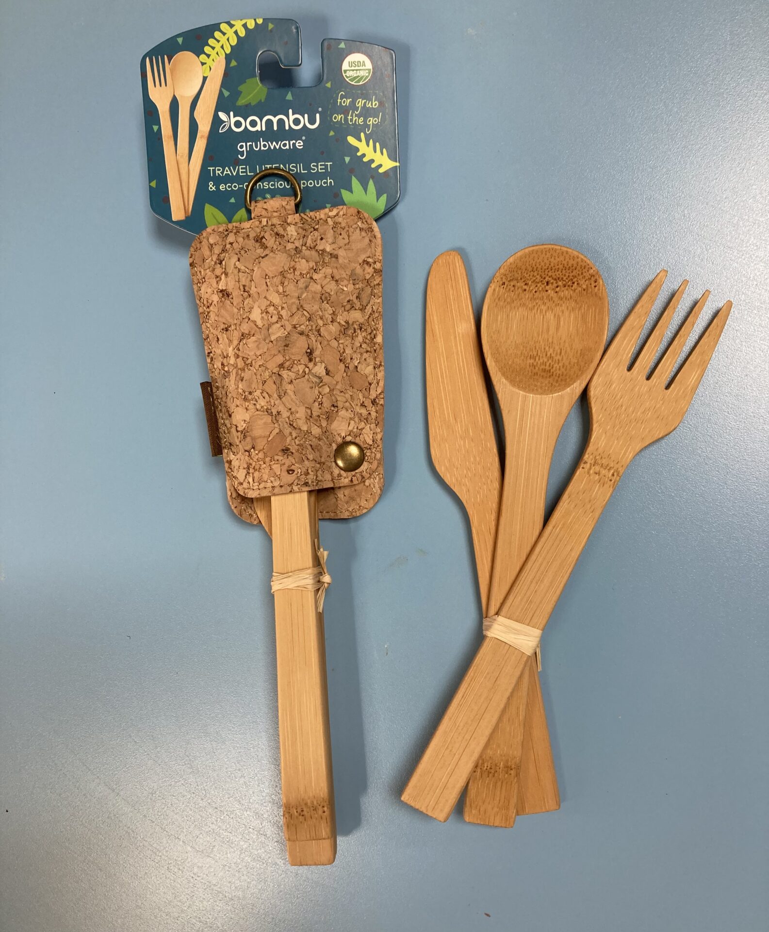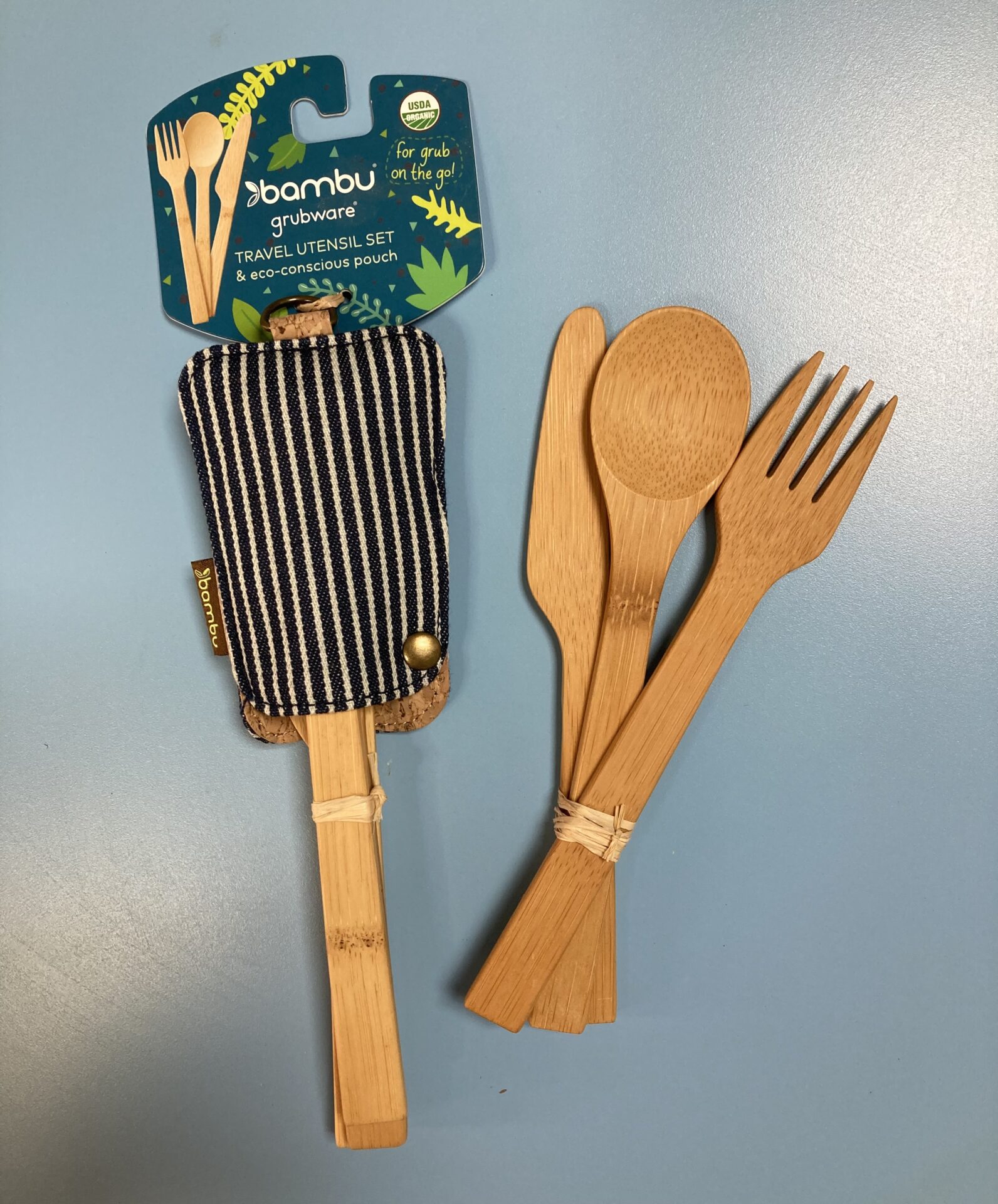 3-piece travel utensil set with storage pouch.