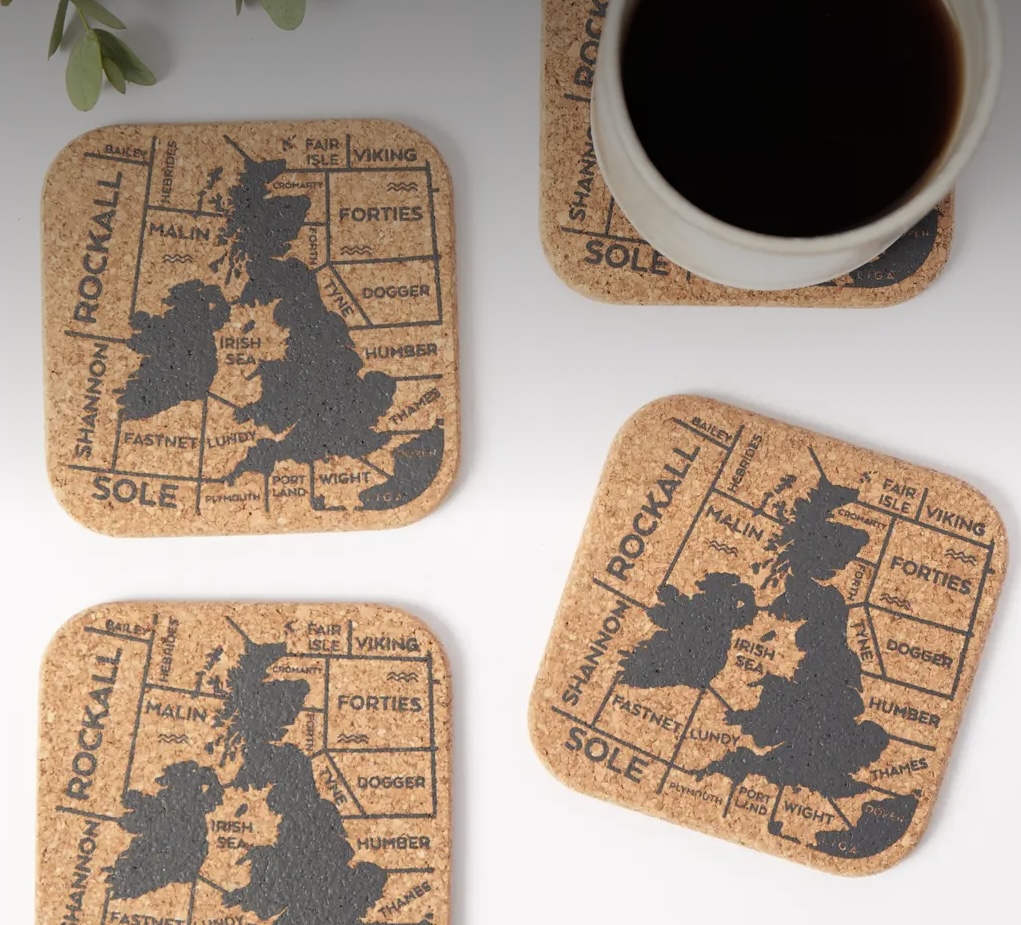 The Shipping Forecast has guided mariners since 1925 but also been relaxing listening to many people during its daily broadcast on BBC Radio Four. To commemorate this milestone, a range of placemats, coasters, and trays have been produced using natural cork. These coasters are sure to be a talking point with guests.