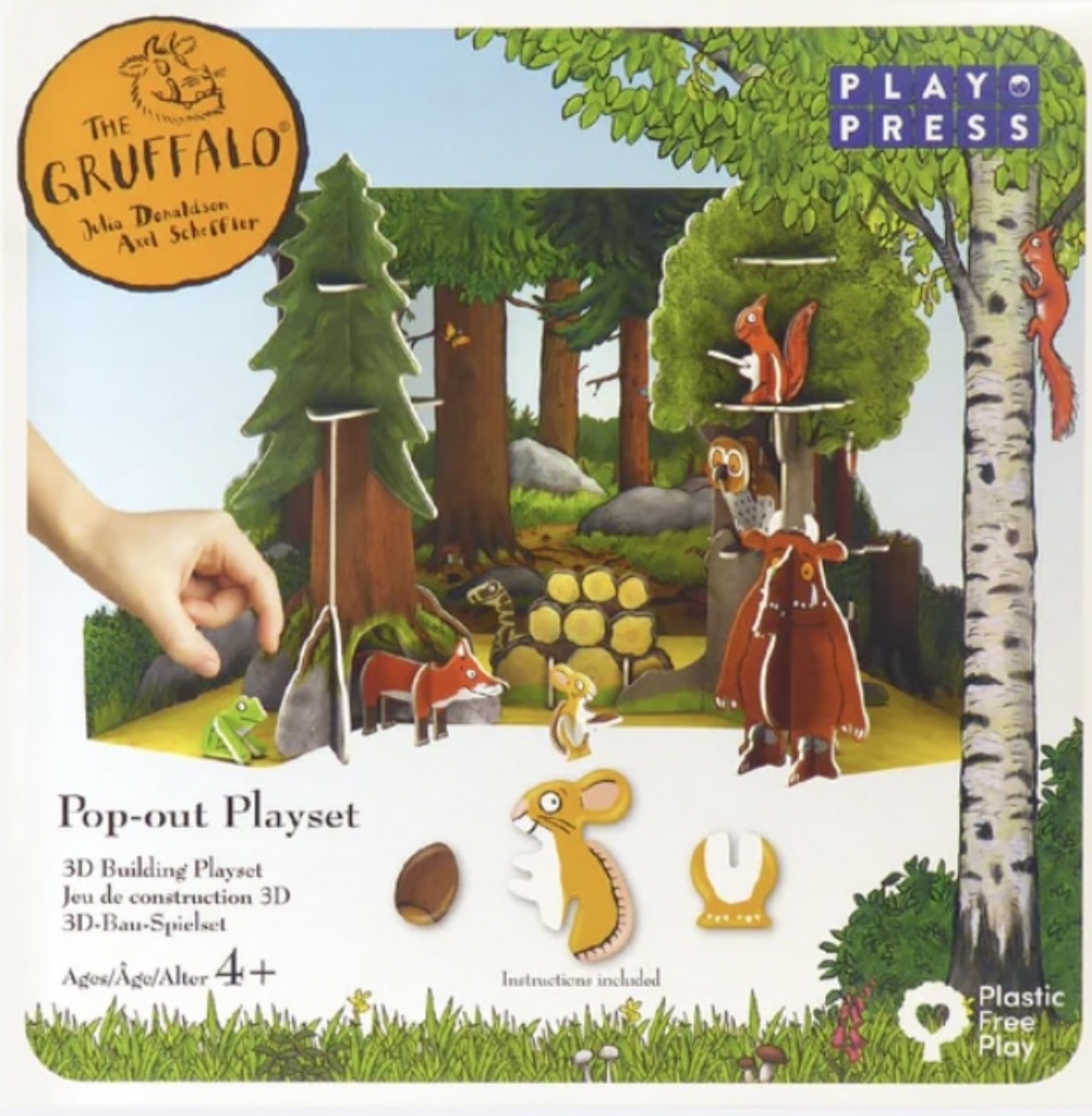 Press out and play to see the much-loved story of Julia Donaldson and Axel Scheffler’s ‘The Gruffalo’ come to life. This 44 piece pop-out playset is made from sturdy and sustainable Playboard which connect and slot together to create the pictured scene.