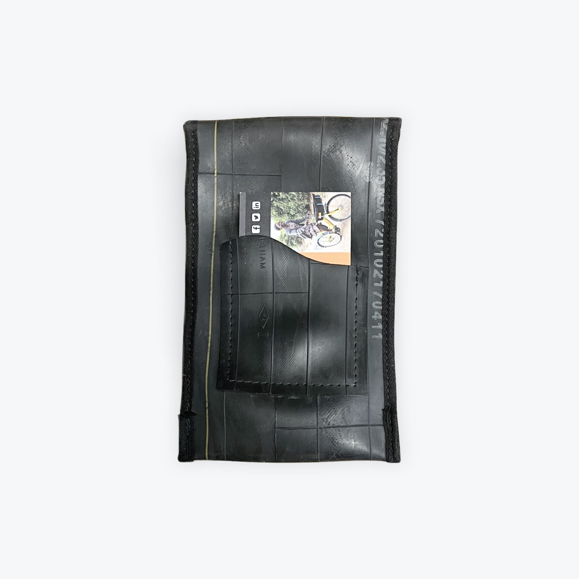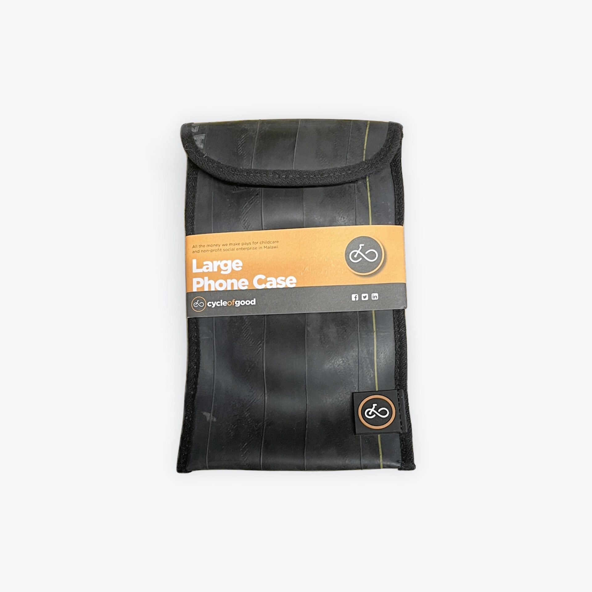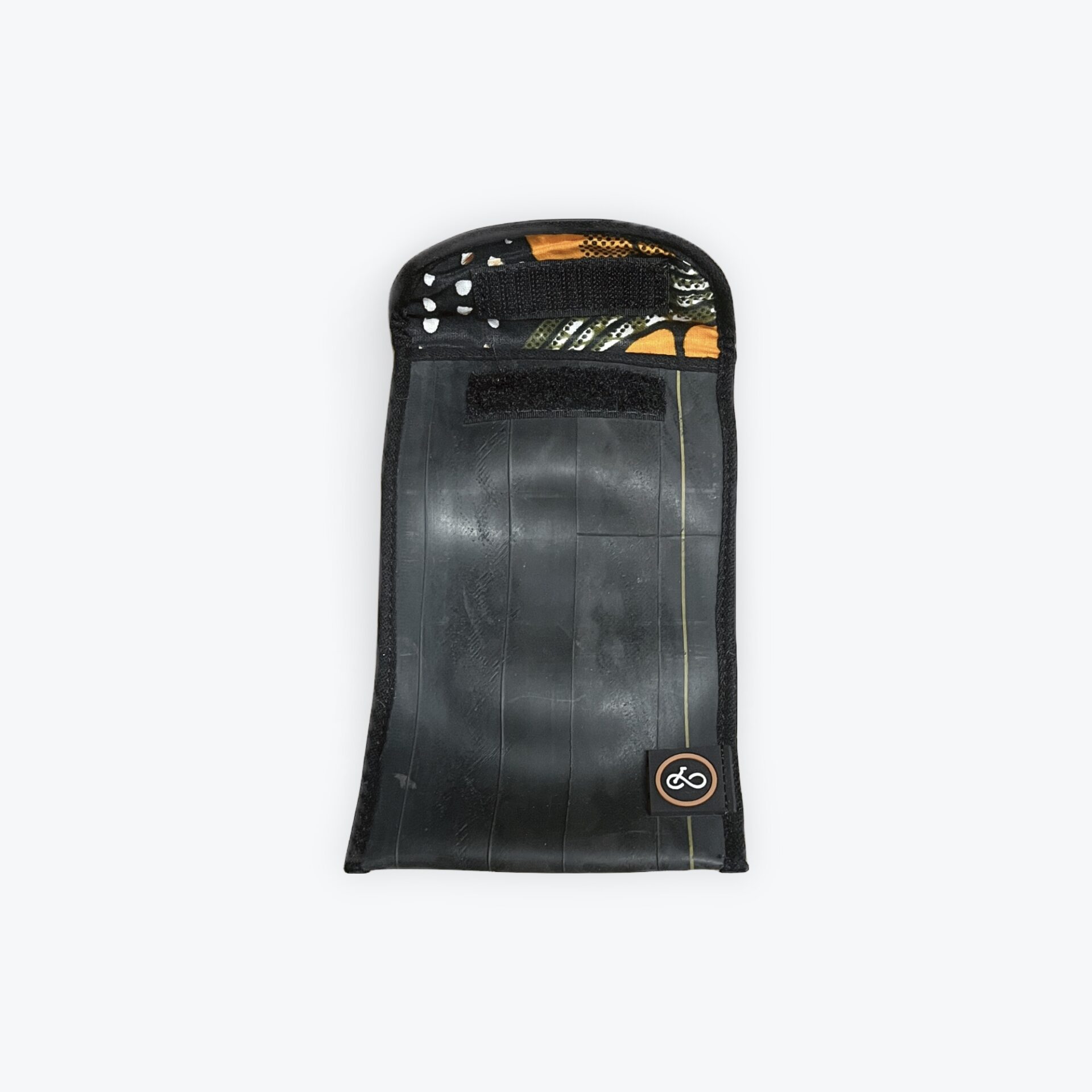 This large phone case is our most popular and measures 160mm x 105mm. Made from recycled bicycle inner tubes with a fabric lining and velcro fastening, it will protect your phone from rain and damage if dropped when not in use. Makes an ideal gift!
