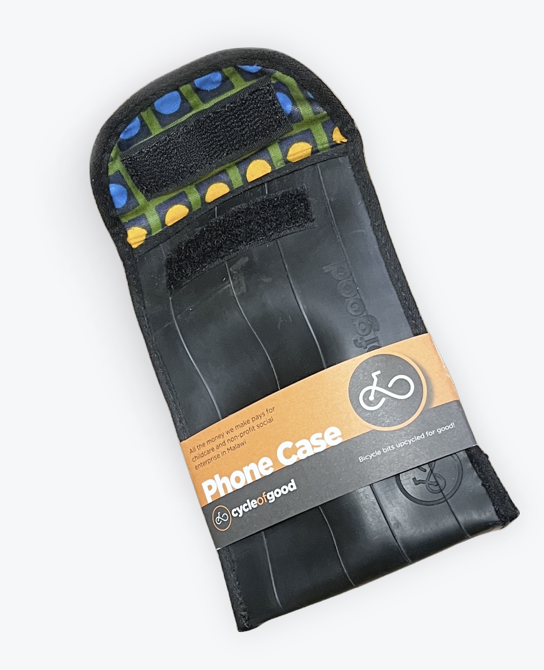 This phone case is perfect for protecting your mobile phone from the rain or being damaged when not in use. Made from recycled bicycle inner tubes with fabric lining and velcro fastening, it measures 100mm x 1500mm. Makes a perfect gift!
