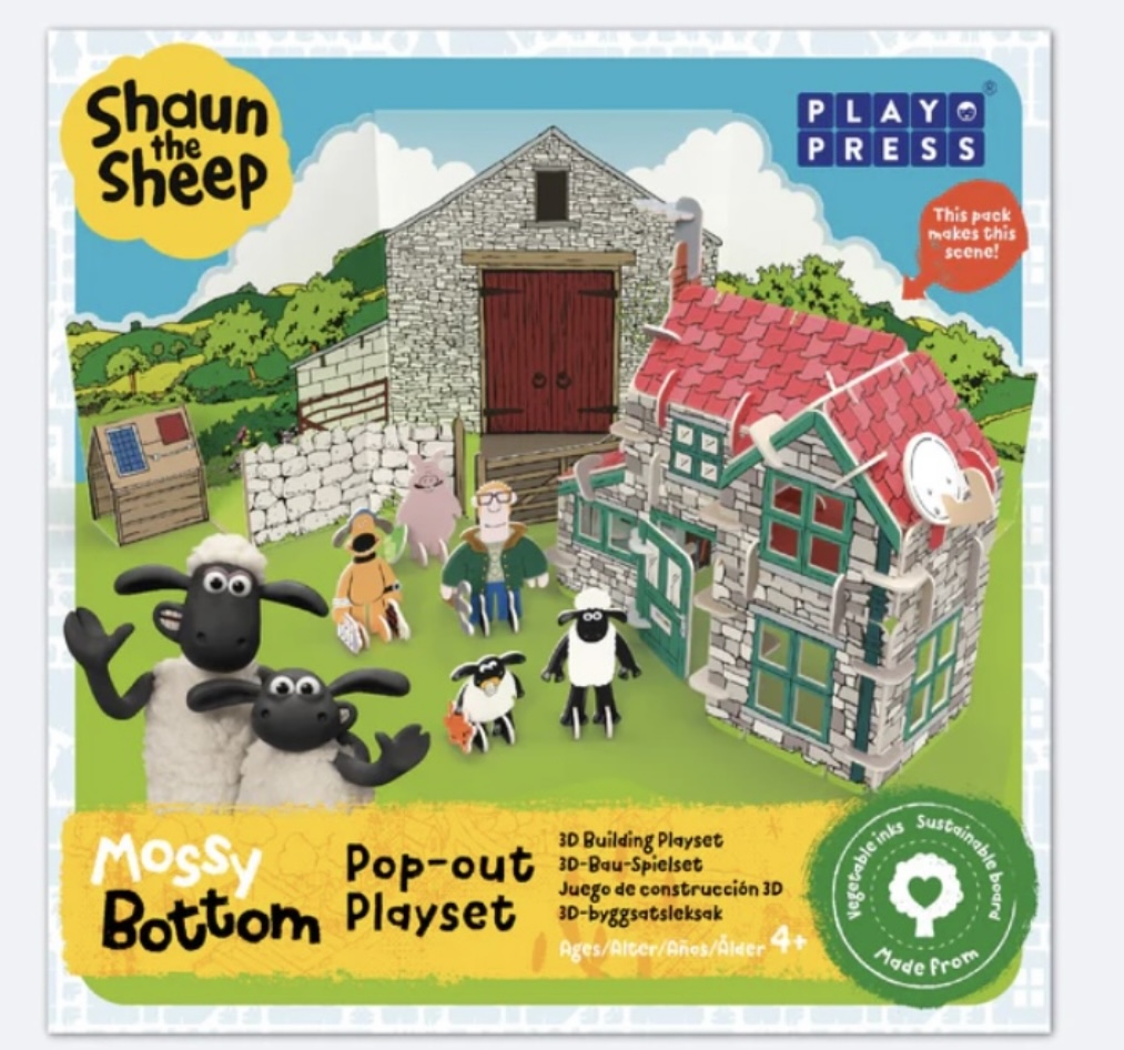 Join in the fun with Shaun the Sheep and his friends at Mossy Bottom Farm but just don’t let the farmer catch you! This 81 piece pop-out playset is made from sturdy and sustainable Playboard which connect and slot together to create the pictured scene.