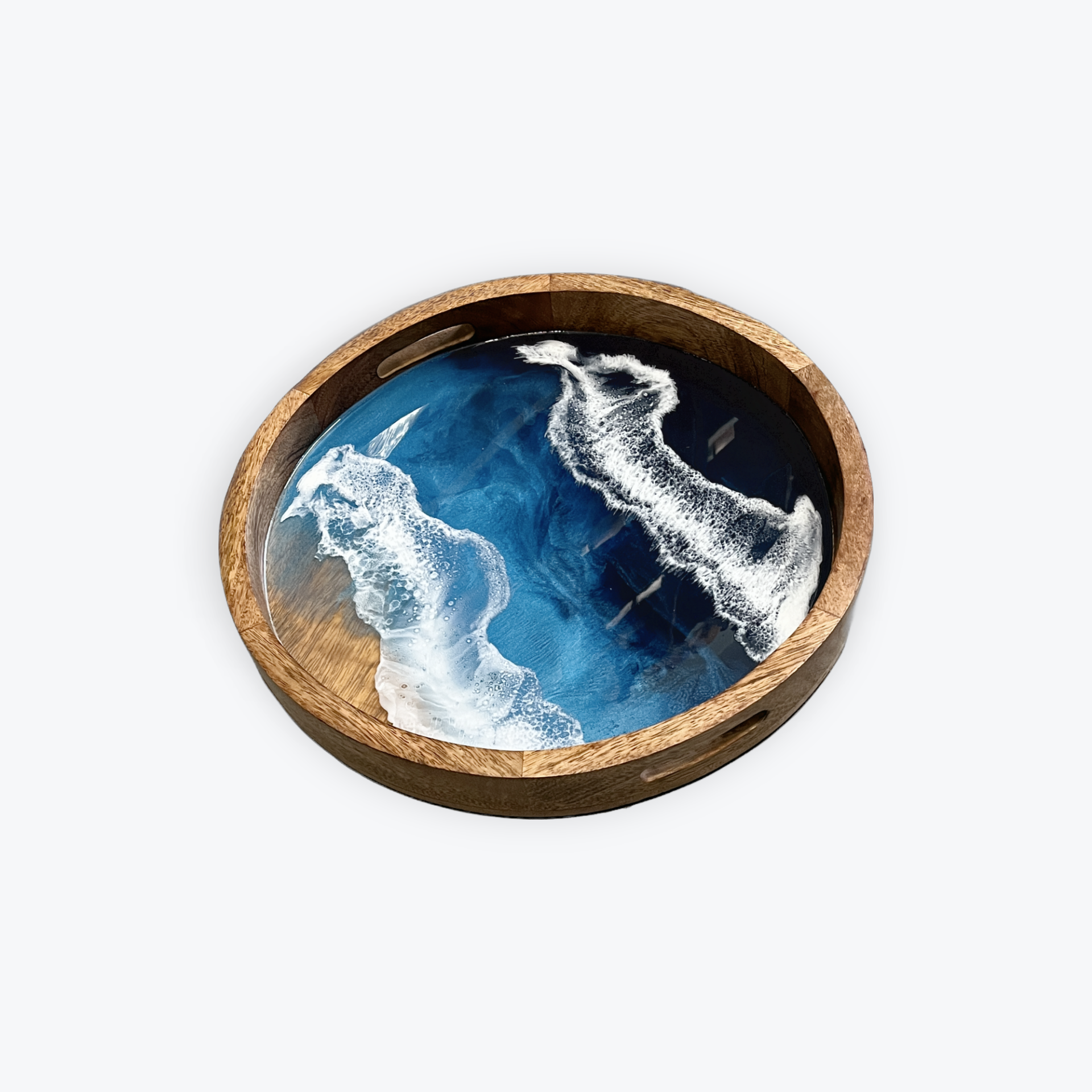 Mango wood tray with resin seascape design. Measures 36cm in diameter, 32.5cm internal size.